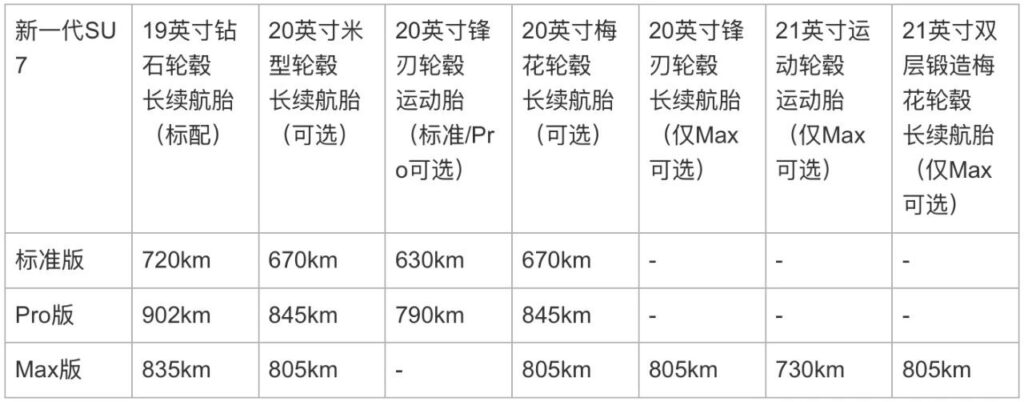 The new‑generation SU7 offers a variety of wheel and tire combinations, with corresponding differences in CLTC cruising range to meet your diverse needs for range, quietness, comfort, and sportiness. You may choose according to your actual usage conditions.
